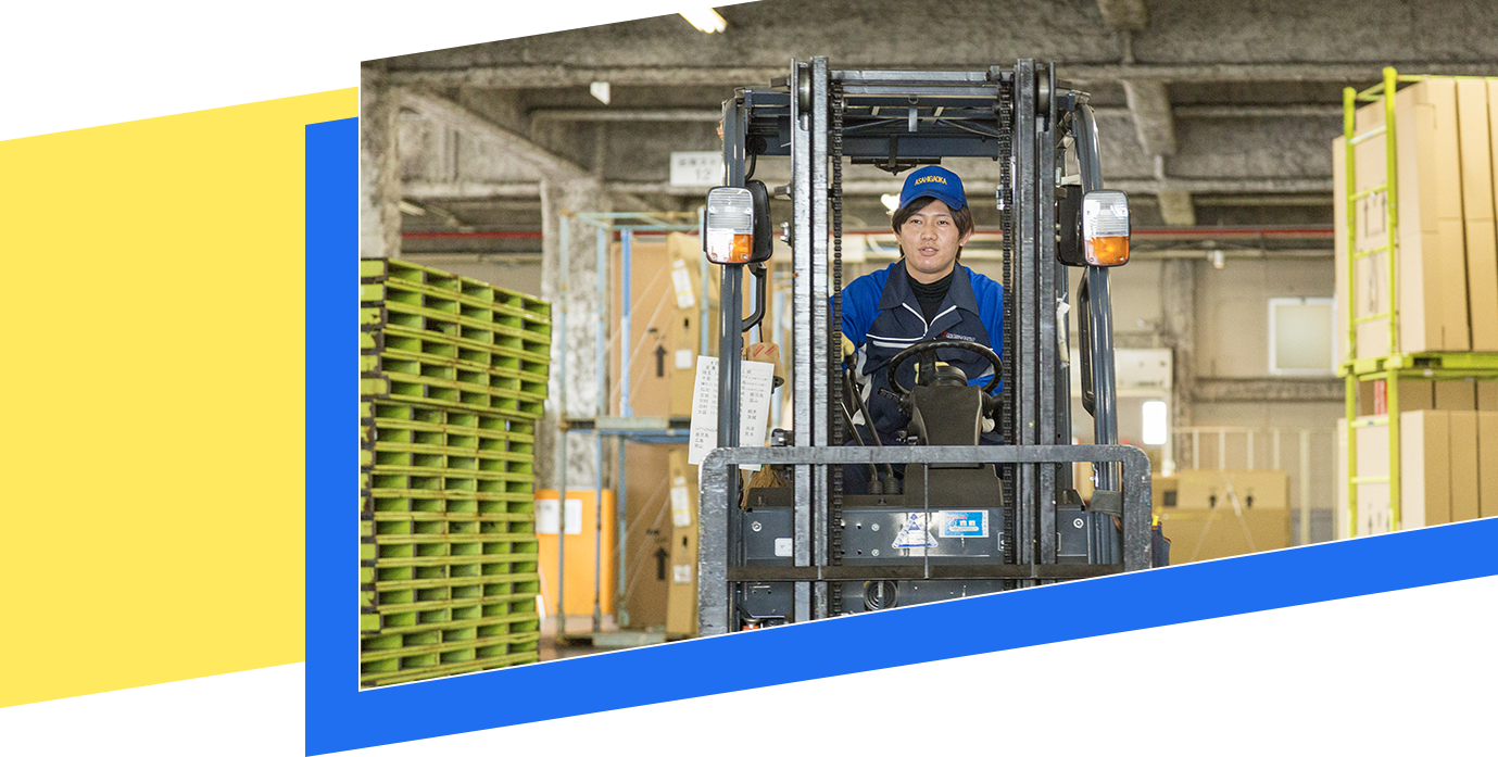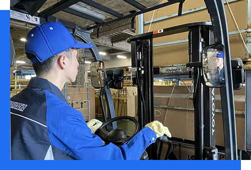 ドアやバンパー、ルーフなどの自動車製品を、カウンターリフトを使って保管場所から集荷し、トラックへ積み込みます。製品の管理にはハンディターミナルというバーコードなどを読み取る機械を使っているので、未経験の方でもすぐに業務に慣れることができます。製品の保管方法の工夫など生産性の向上についてはメンバー全員で協力して行っており、こうした改善は現場で実際に作業を行っているスタッフがアイデアを出し、年齢や役職関係なく意見を言い合える環境です。
